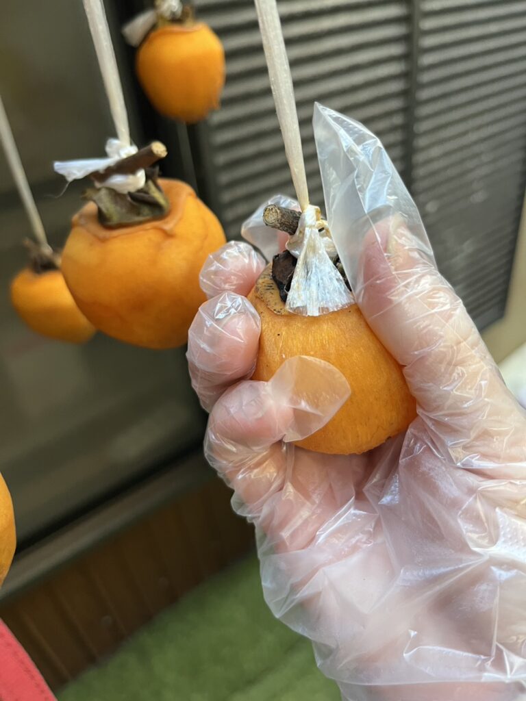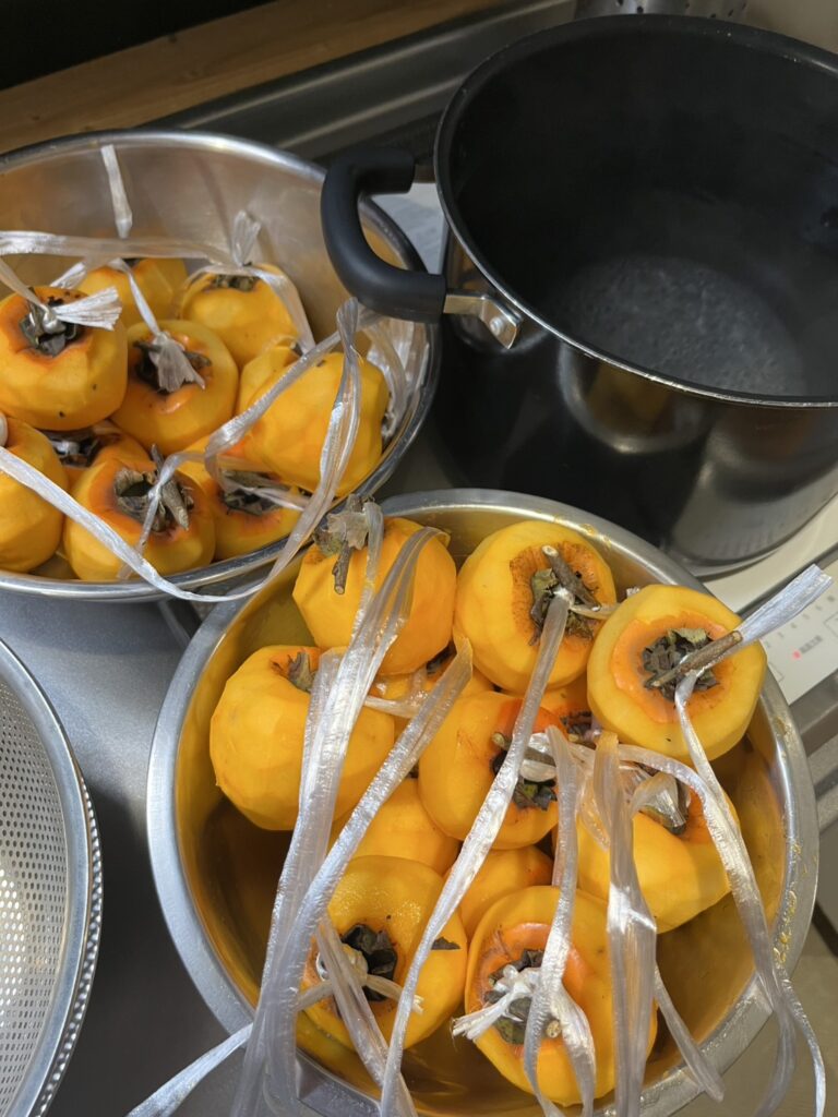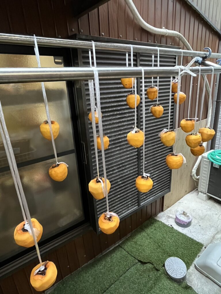 おいしい甘柿と干し柿用の渋柿をいただき、干し柿作り手伝って~と持ち掛けておいて、夜遅くなってしまい「明日やろうかな~」と呟くと、なんと乙女から「え~やろうよ。今からやろうよ~、柿の皮いっしょに剥くよ」とやるき満々。おかげで無事に干し柿吊るせました。